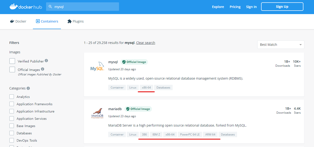 하지만 이러한 Docker 환경에서도 이미지에 따라 지원하는 CPU 아키텍쳐의 종류가 다릅니다. 예를 들어 Docker hub에서 MySQL을 검색 시 MySQL 이미지의 경우 x86_64(일반적인 인텔이나 AMD CPU) 아키텍쳐만 지원하는 것을 알 수 있으며, 바로 아래 있는 MariaDB 이미지의 경우 x86_64 뿐만 아니라 x86(32Bit), Arm64(모바일이나 Mac M1 칩, AWS Graviton2 프로세서) 등 여러 CPU 아키텍쳐를 지원하는 것을 알 수 있습니다.