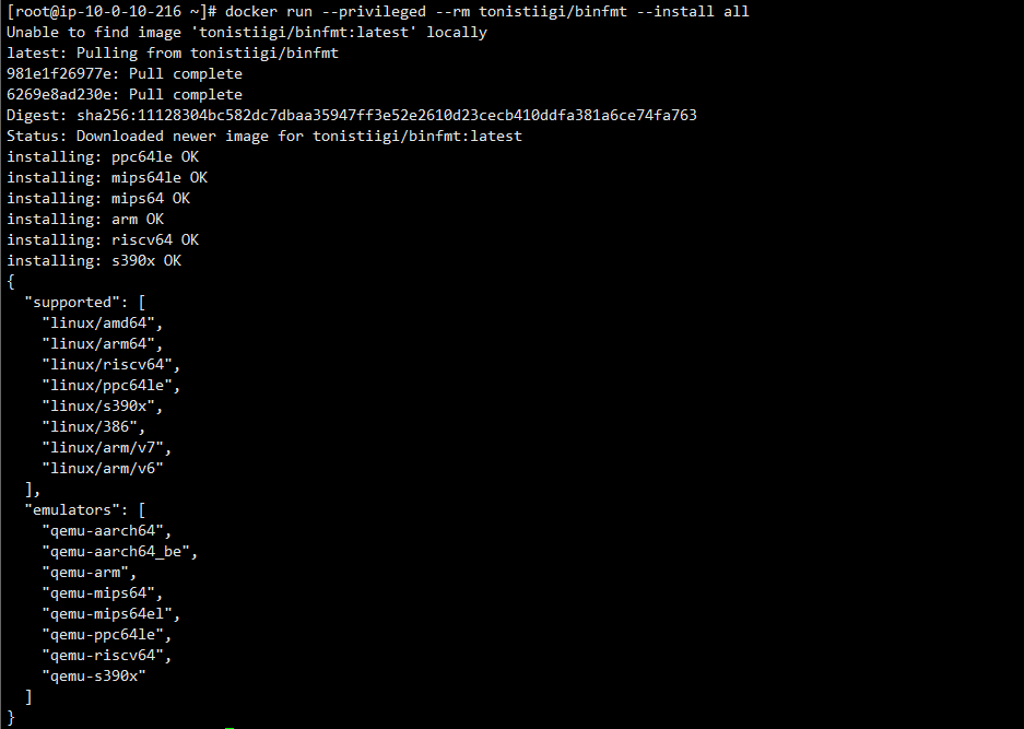 docker run --privileged --rm tonistiigi/binfmt --install all지원하는 플랫폼의 종류를 추가하도록 위의 docker run 명령어를 수행 시 아래와 같은 출력이 보여집니다.(참고용)