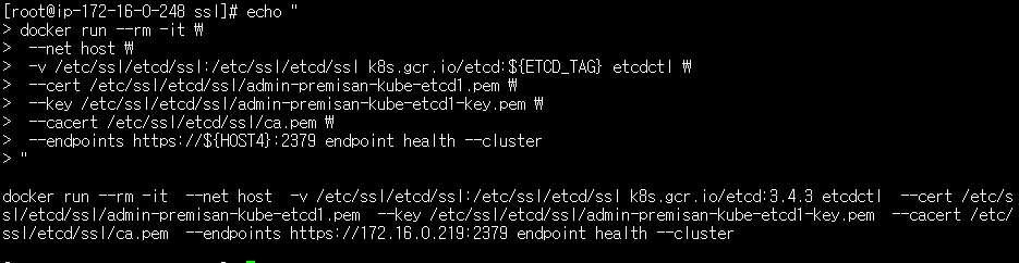 마스터노드에서 etcd 클러스터 상태 확인을 위한 커맨드를 생성합니다.