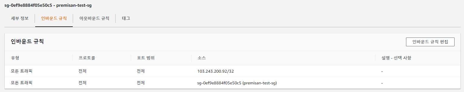 보안그룹은 사무실 공인 아이피와 쿠버네티스 노드로 사용할 인스턴스가 포함된 보안그룹끼리는 모든 트래픽을 오픈하였습니다.