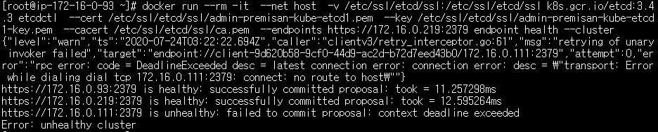 전 단계에서 실행했던 헬스 체크 명령어를 다시 실행해봅니다. 172.16.0.111(HOST5) etcd 노드가 unhealthy 상태로 확인됩니다.