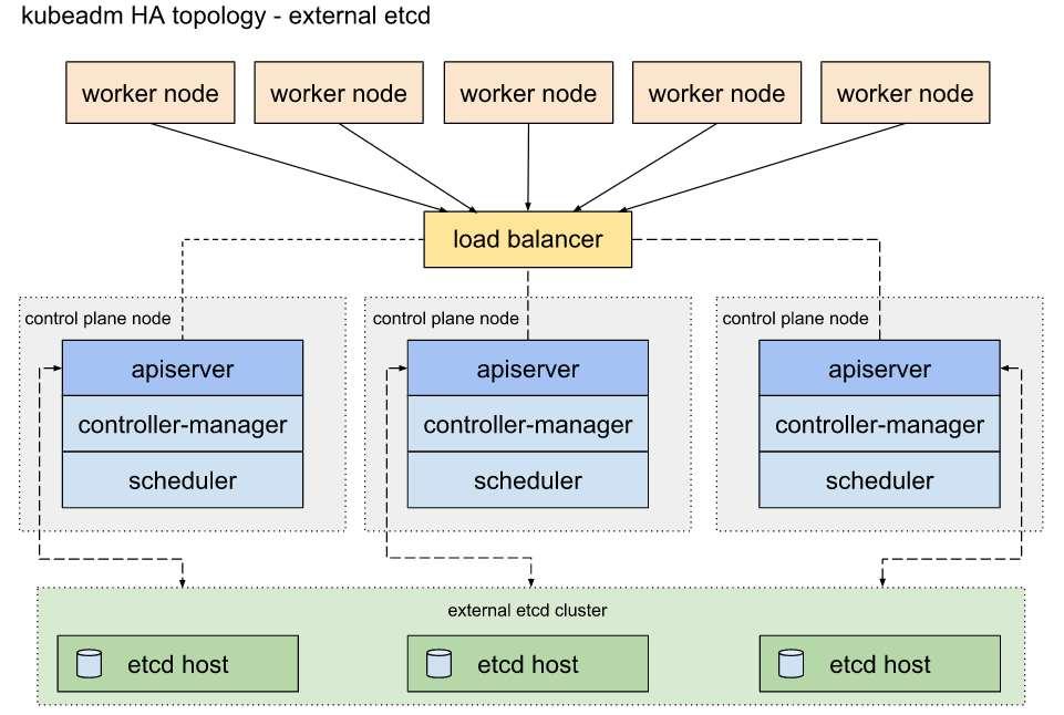 3) etcd 가 외부에 있기 때문에 마스터노드(kube-apiserver)에 부하가 발생하여도 stacked etcd 구성에 비해 etcd에 미치는 영향도가 적음