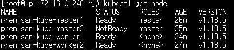 NODE 부분을 보시면 워커노드1과 워커노드 2에 포드가 고르게 분산되어 있는 것을 확인할 수 있습니다. 이제 워커노드 중 하나를 다운시킵니다. 전 워커노드1을 다운시켰습니다. 노드의 상태를 체크하는 kube-controller-manager에서 응답이 없는 노드에 대해 비정상 상태로 전환하는 설정인 node-monitor-grace-period 옵션값의 기본값은 40초로 설정되어 있기 때문에 40초가 경과하면 아래와 같이 워커노드1의 STATUS가 "NotReady" 상태로 전환됩니다.