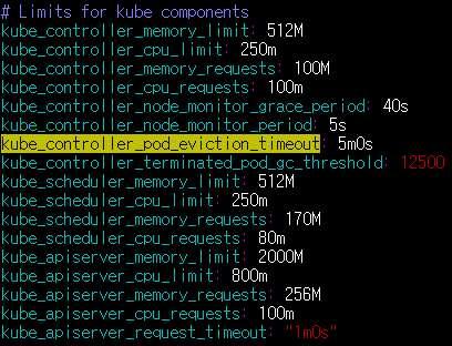 만약 워커노드 다운 시 더 빠르게 정상 노드에서 새 포드를 생성하도록 하려면 클러스터 초기 구성 시 pod-eviction-timeout 옵션 값을 기본값인 5분보다 더 짧게 세팅하면 되겠습니다. 해당 설정값은 ~/kubespray/roles/kubernetes/master/defaults/main/main.yml 파일에 아래와 같이 기본값으로 설정되어 있는 것을 확인할 수 있습니다.