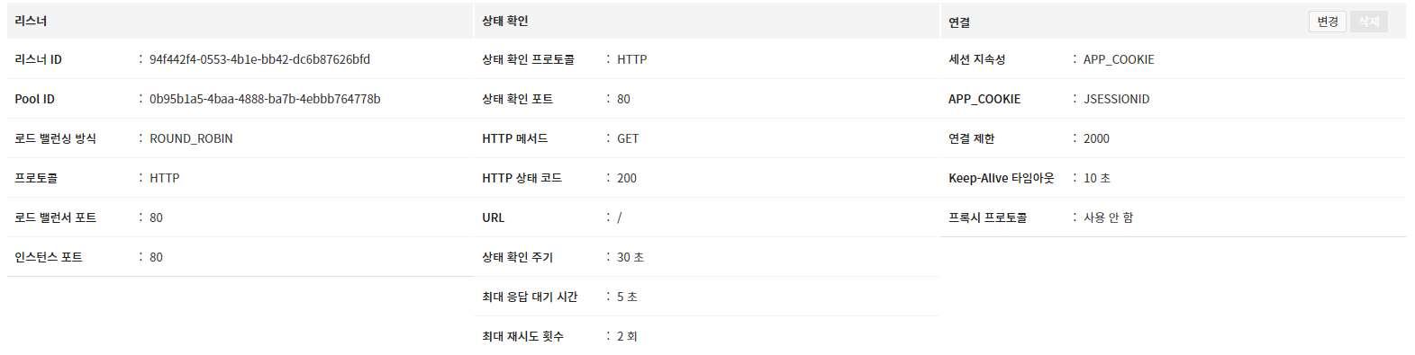 [참고] 로드 밸런서에 TCP 세션 연결 유지시간을 설정할 수 있습니다. Keepalive timeout 값을 설정하여 클라이언트와 로드 밸런서, 로드 밸런서와 서버간 세션 유지 시간을 조정할 수 있습니다.