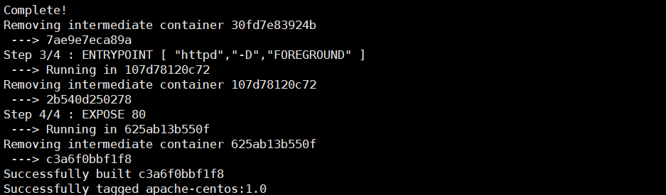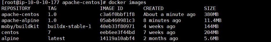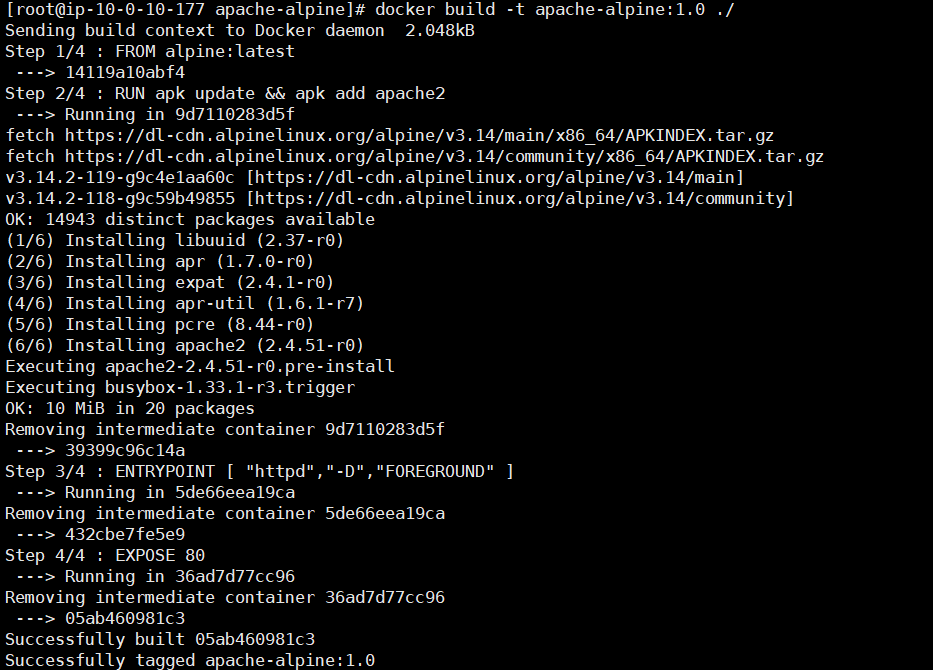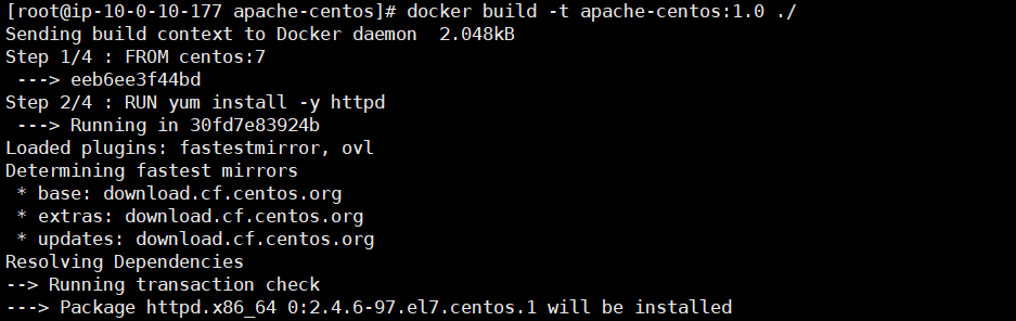 docker build -t apache-centos:1.0 ./이미지 빌드를 실행합니다.