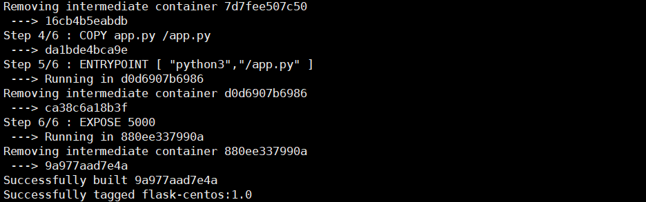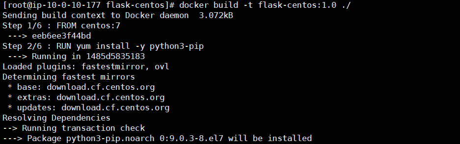 docker build -t flask-centos:1.0 ./빌드를 실행합니다.