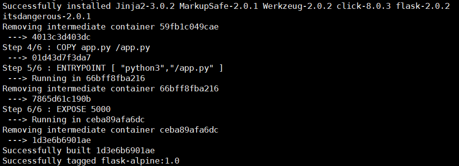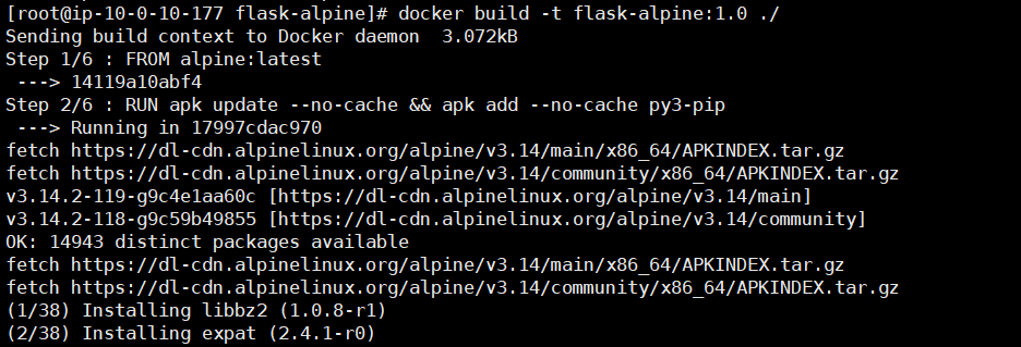 docker build -t flask-alpine:1.0 ./이제 이미지를 빌드해보겠습니다.