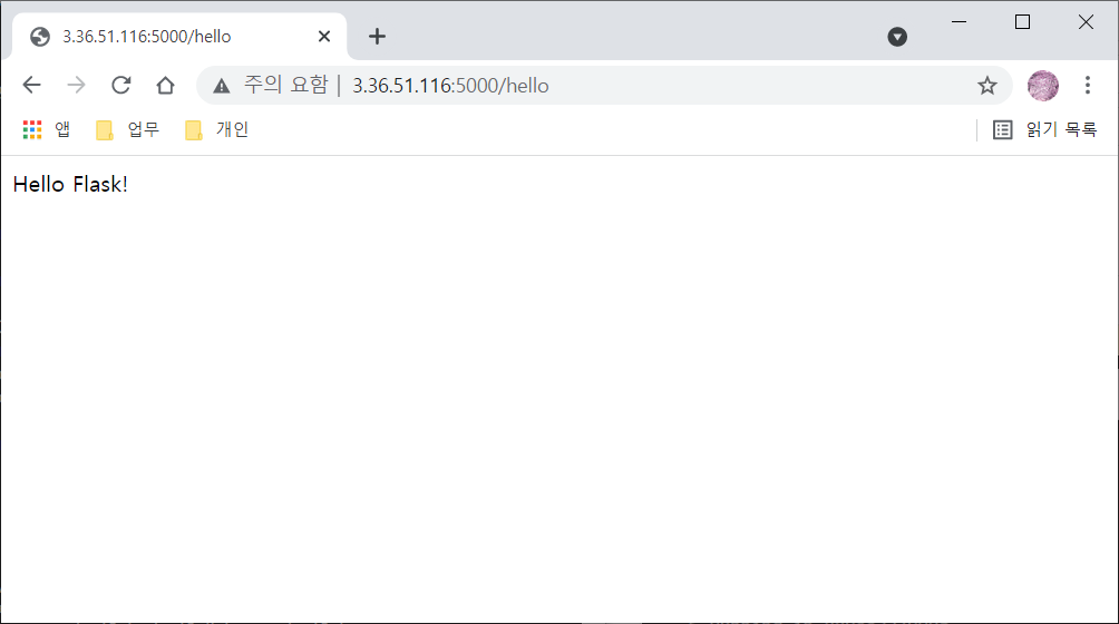 docker run -d -p 5000:5000 --name flask-alpine flask-alpine:1.0접속 시 포트(:5000)와 경로(/hello)에 유의하여 접속해봅니다. 정상적으로 접속되는 것을 확인할 수 있습니다.