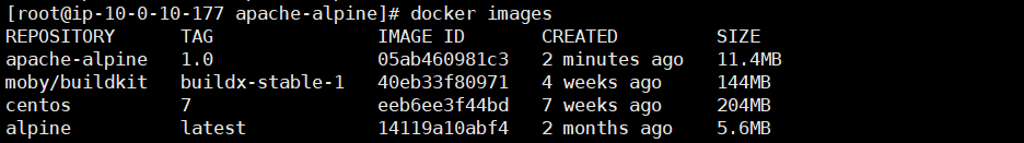 Alpine Linux 이미지를 베이스로 만든 apache 이미지는 약 11MB의 용량을 가집니다.