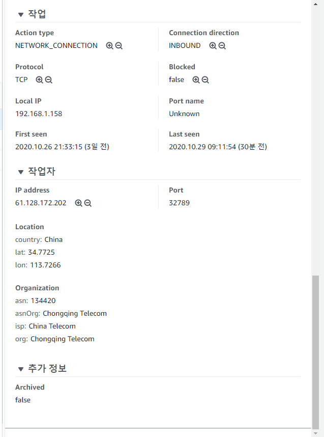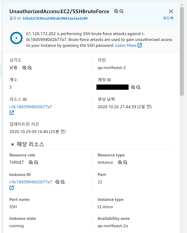 항목을 클릭하면 우측에 아래와 같이 탐지한 위협에 대한 상세 정보를 확인할 수 있습니다. 항목은 크게 위협에 대한 요약, 위협이 발생한 AWS 리소스, 발생한 위협에 대한 정보, 위협을 발생시킨 공격자에 대한 정보로 구성되어 있습니다.