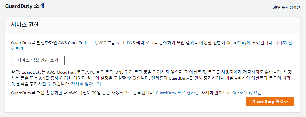 GuardDuty 는 30일의 무료 평가판을 제공하여 별도 비용 없이 30일 동안 무료로 GuardDuty 를 체험해볼 수 있습니다. AWS 콘솔의 GuardDuty 서비스로 이동하여 GuardDuty를 활성화합니다. 아래와 같이 권한 및 무료 체험에 대한 안내가 있습니다.