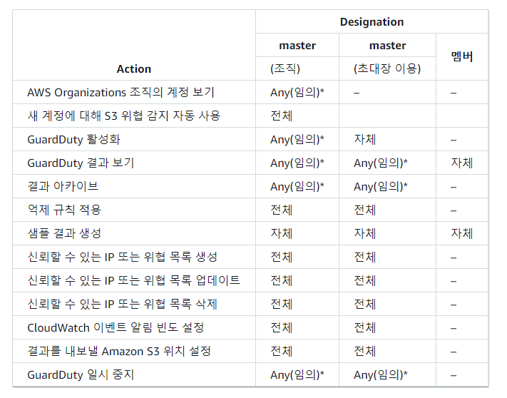 GuardDuty 마스터와 멤버는 각각 아래와 같이 권한을 가집니다.