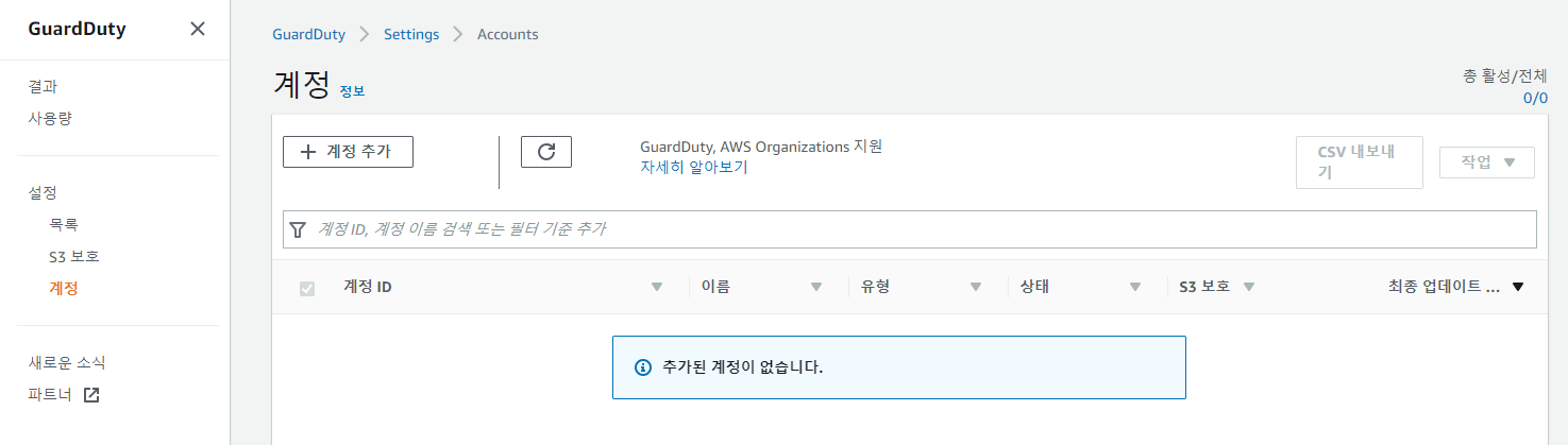 GuardDuty 는 AWS Organizations 를 지원하여 계정 메뉴를 통해 조직에 속한 여러 AWS 계정을 통합하여 관리할 수 있습니다.