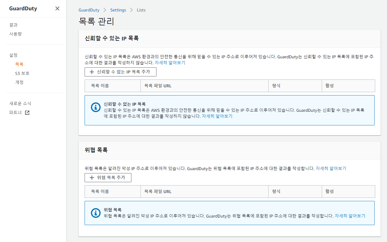 추가적으로 설정-목록 메뉴를 통해 신뢰할 수 있는 IP 목록을 추가하여 신뢰할 수 있는 소스 아이피는 모니터링에서 제외하거나, 위협적인 IP 목록을 설정하여 모니터링 대상 범위를 좁히는 것이 가능합니다.