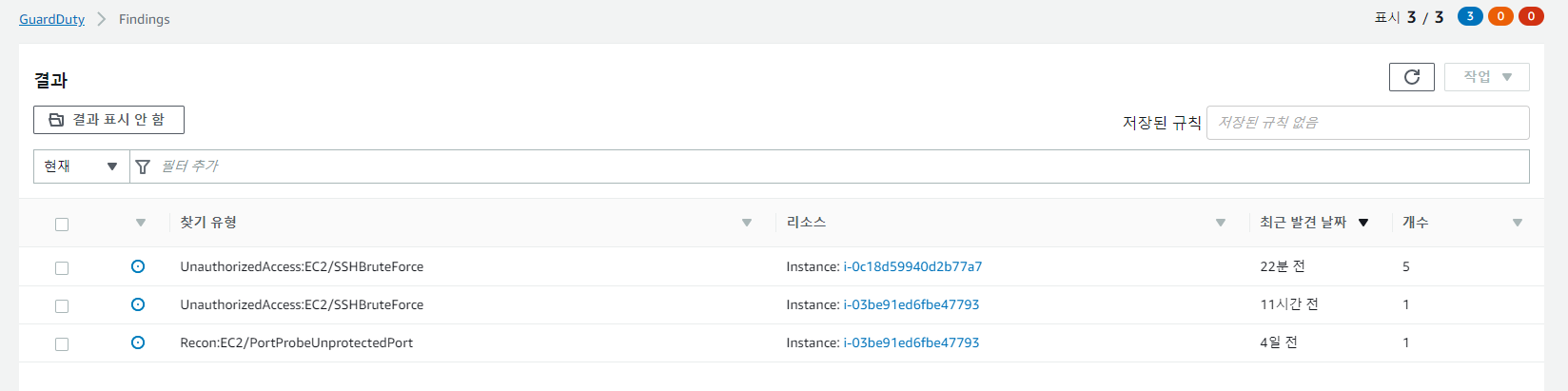 "결과" 메뉴로 들어가보면 현재 GuardDuty 에 의해 탐지된 위협을 확인할 수 있습니다.