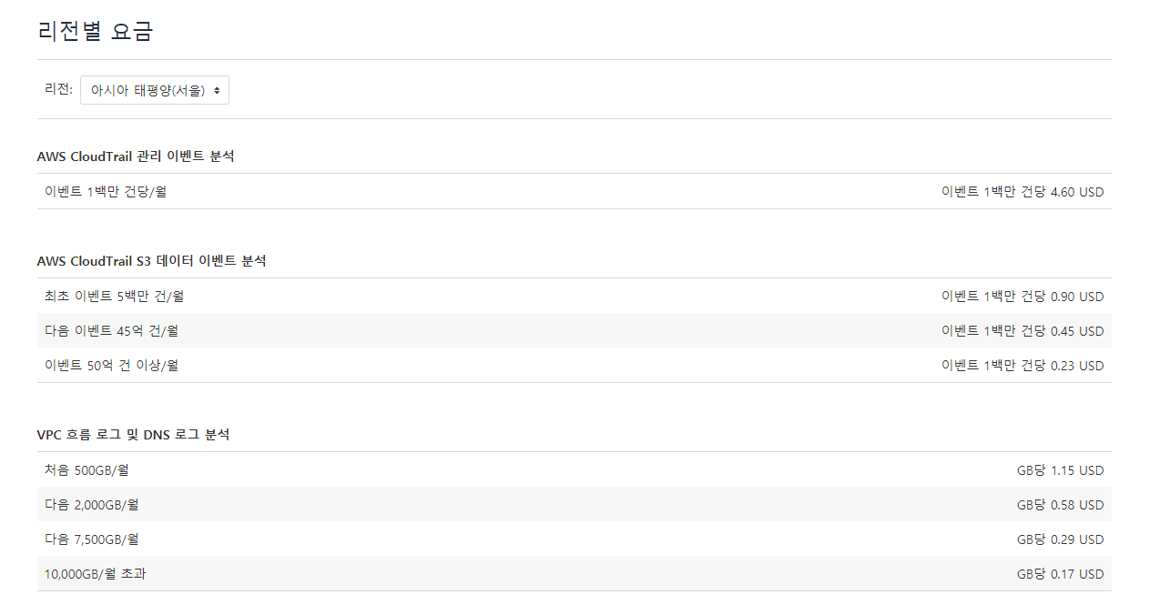 무료체험 기간이 종료되면 아래와 같은 기준으로 비용이 발생합니다. 때문에 AWS에서 이용하고 있는 리소스가 많을수록 비용이 많이 발생하는 것으로 생각됩니다. GuardDuty는 사용량 메뉴를 통해 일일 평균 비용을 예측해볼 수 있습니다.
