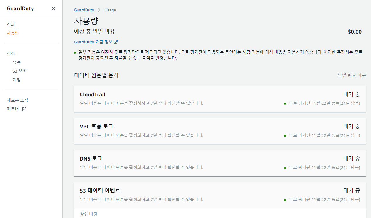 GuardDuty 는 발생한 원본 데이터(이벤트, 로그)의 양에 따라 비용이 발생하기 때문에 "사용량" 메뉴에서는 데이터 원본별로 어느정도의 비용이 발생하는지 일일 평균 비용을 확인할 수 있습니다. 무료 체험 기간에도 예상 비용을 확인해볼 수 있으나, 7일 이상의 데이터가 축적되어야 확인이 가능하다고 합니다.