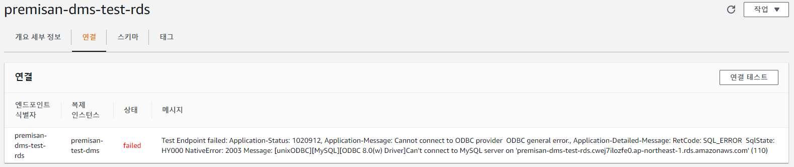 DMS의 데이터 복제 방식이 MySQL 리플리케이션과 같은 비동기 방식인지 확인하기 위해 의도적으로 DMS 복제 인스턴스로부터 RDS로의 연결이 불가능하도록 보안그룹 설정을 제거합니다. 아래와 같이 대상 엔드포인트의 연결 테스트 시 failed 상태로 나타나는 것을 알 수 있습니다.