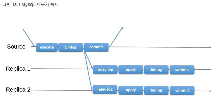 비동기 방식의 복제란 마스터(원본) 서버에서 새로운 데이터의 commit이 발생할 때 슬레이브 서버의 응답을 확인하지 않고 일방적으로 바이너리 로그만을 전송하여 복제하는 방식입니다. 마스터 서버에서 슬레이브 서버의 응답을 확인하고 데이터를 commit하는 동기식 복제 방식보다 대역폭을 적게 사용하는 장점은 있으나, 슬레이브 서버의 응답을 확인하지 않기 때문에 데이터의 불일치가 발생할 수 있습니다.