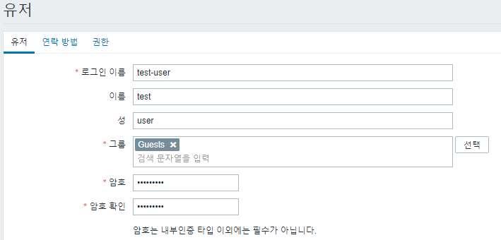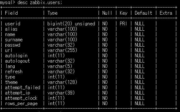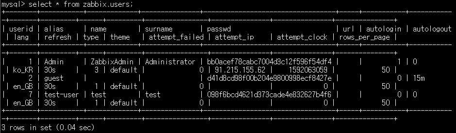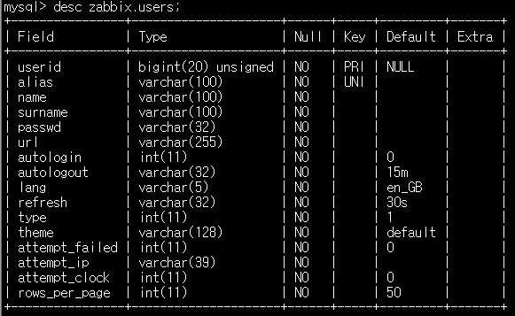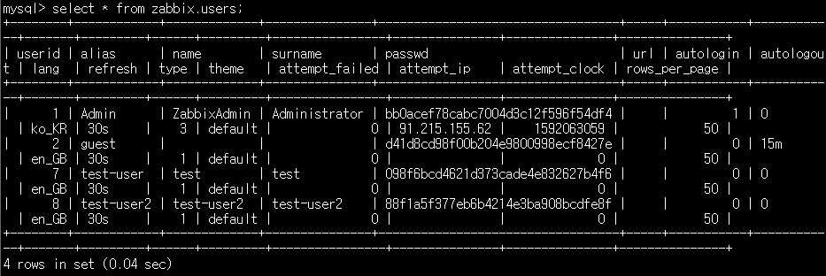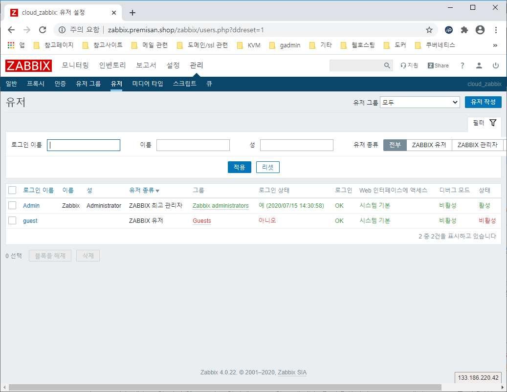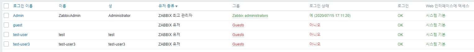 zabbix-front-web 설정 파일 : /etc/zabbix/web/zabbix.conf.php정상적으로 등록된 호스트, 유저, 아이템 등이 보이는지 확인해봅니다.