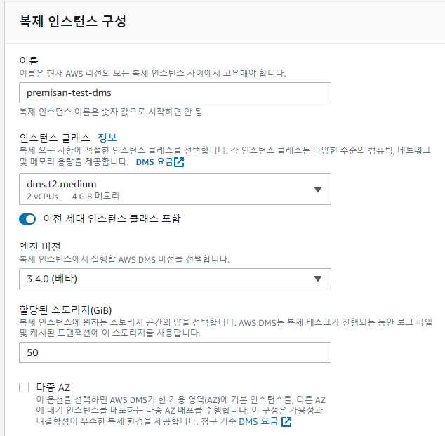 먼저 양쪽 엔드포인트 데이터베이스 간의 데이터 복제를 수행할 복제 인스턴스를 구성합니다. (생성한 복제 인스턴스는 별도로 AWS 콘솔 EC2 인스턴스 목록에 보이지는 않습니다.) AWS 콘솔 > AWS Database Migration Service 페이지 > 복제 인스턴스 항목으로 이동하여 복제 인스턴스 생성 버튼을 눌러 복제 인스턴스를 생성합니다.