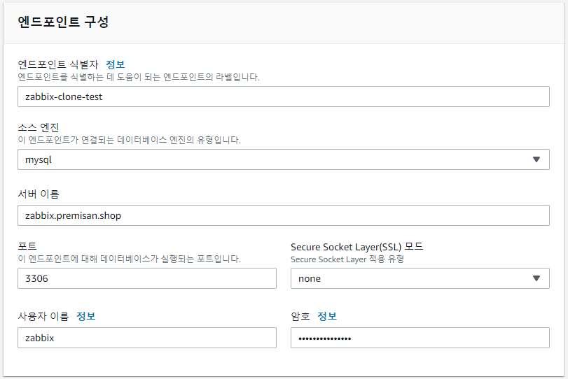 대상 엔드포인트로 데이터 복사가 정상적으로 완료되었다면 소스 엔드포인트에서 새로 데이터를 추가하여 데이터가 실시간으로 대상 엔드포인트로 복제되는지 테스트해봅니다. 다시 zabbix-server 에 연동된 데이터베이스를 소스 엔드포인트 데이터베이스로 변경한 뒤, 유저명을 test-user로 하여 새로운 유저를 생성합니다.