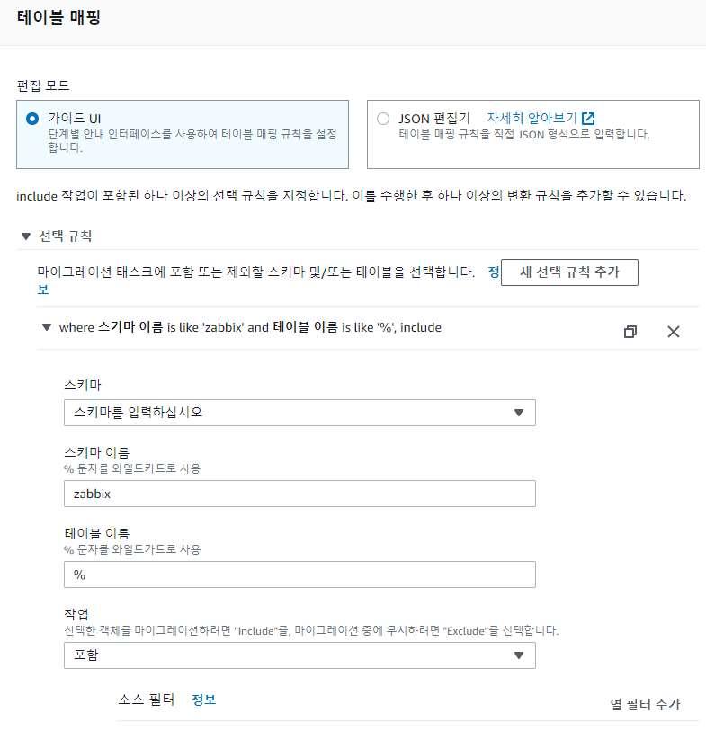테이블 매핑 섹션은 어떤 데이터베이스의 어떤 테이블을 복제할지 구성하는 부분입니다. 테스트 구성에서는 zabbix 데이터베이스만 복제할 것이므로 스키마 이름(데이터베이스 이름) 부분에 zabbix를 지정해줍니다. (MySQL 데이터베이스 시스템 설정이 저장되는 mysql 데이터베이스는 복제 시 에러가 발생하는 것으로 확인됩니다)