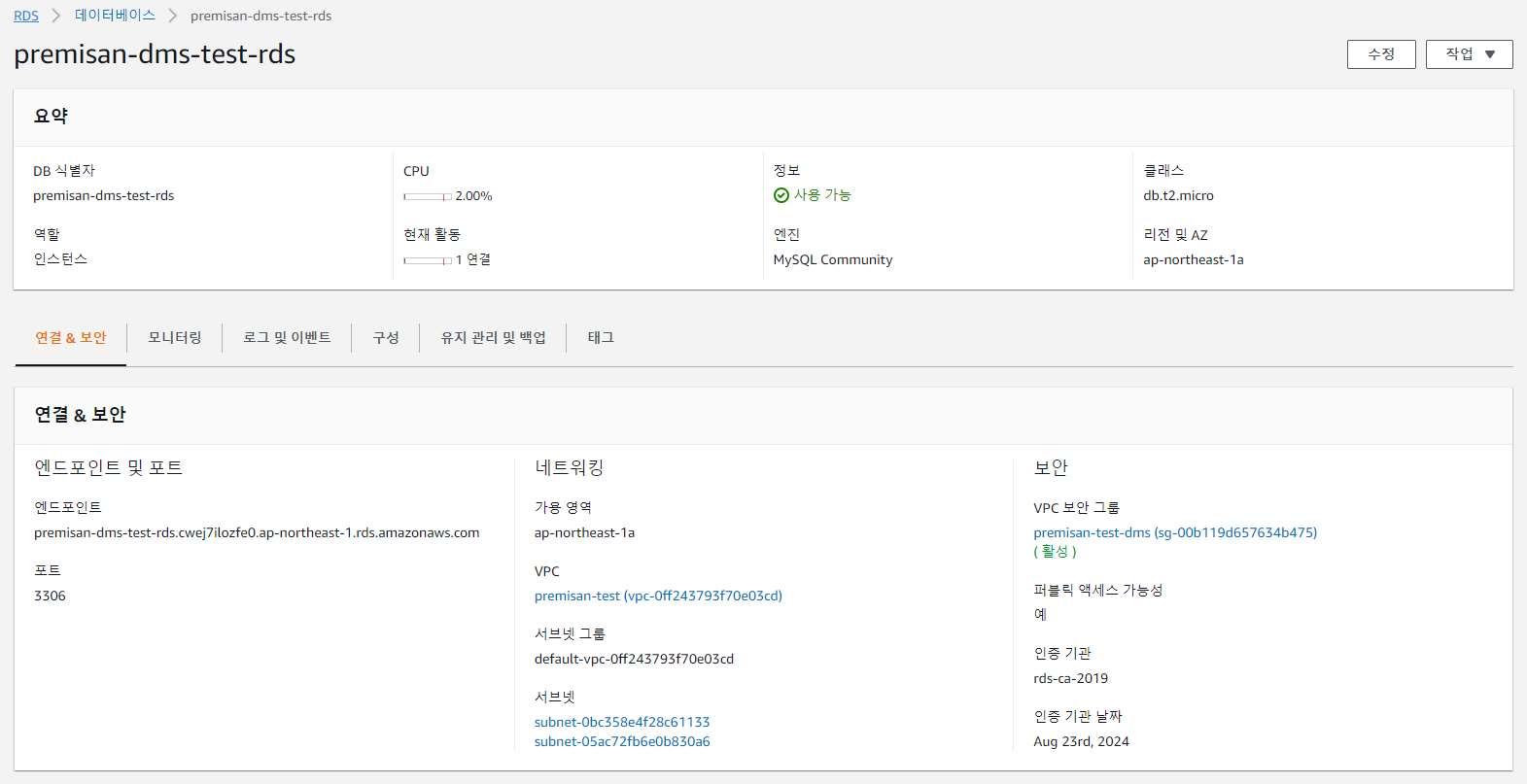 온프레미스 데이터베이스를 EC2 인스턴스에 직접 MySQL 구성하여 리플리케이션 구성하는 방법도 있지만 EC2 인스턴스는 사용자의 관리가 필요하기 때문에 온프레미스 데이터베이스를 관리형 데이터베이스 서비스인 AWS RDS로 실시간 복제가 가능하다는 점이 DMS 서비스를 이용하여 실시간 복제를 구성하는 것의 장점이라는 생각이 들었습니다. 테스트 중 추가적으로 DMS를 통한 데이터베이스 복제 시 데이터만을 복제하기 때문에 테이블의 key, default 등의 구조는 복제하지 않는 것을 알게되었습니다. (찾아보니 데이터만 복제하기 때문에 테이블 구조는 수동으로 먼저 복제하고 DMS로 데이터 복제를 진행해야한다고 합니다) 해당 부분은 복제 구성 시 반드시 참고해야할 것 같습니다.