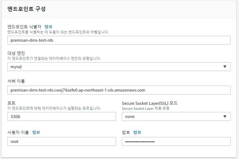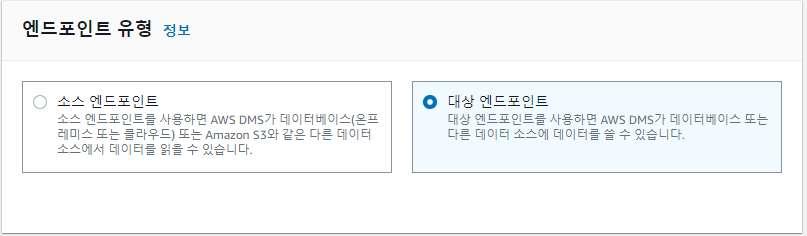 소스 엔드포인트 생성 방법과 동일하게 대상 엔드포인트를 생성합니다.