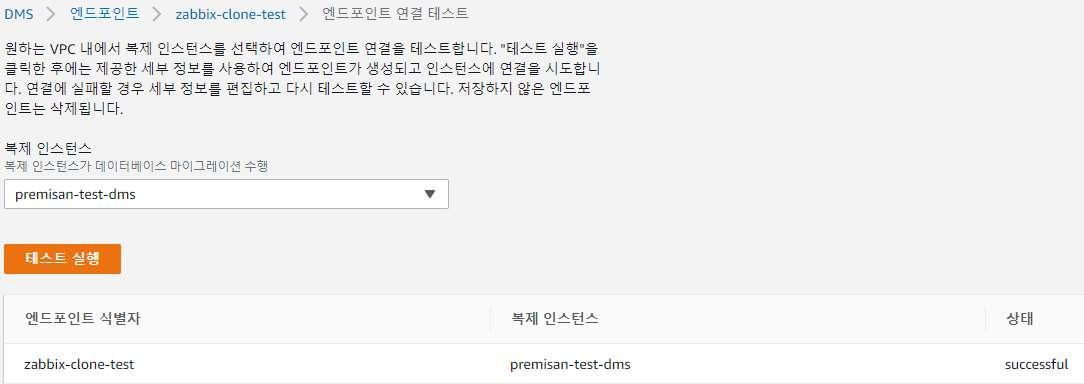 소스 엔드포인트 추가가 완료되면 해당 엔드포인트 이름을 클릭 > 연결 탭으로 이동하여 연결 테스트를 진행합니다. 복제 인스턴스에서 정상적으로 소스 엔드포인트로 접속이 가능하면 successful 이라는 문구가 보여집니다. 실패 관련 문구가 노출된다면 소스 엔드포인트의 방화벽 및 DB 접근 권한을 확인하시기 바랍니다.