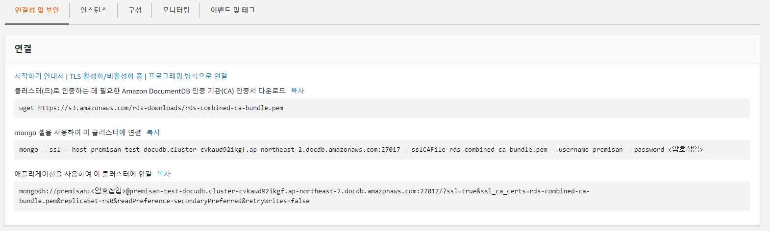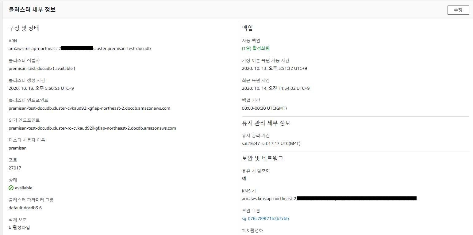 RDS와 동일하게 KMS를 통한 암호화를 지원하며, 클러스터 생성 시 클러스터 엔드포인트와 읽기 엔드포인트가 별도로 구성된 것을 확인할 수 있습니다. 통신을 위해서는 TCP 27017 포트를 사용하며, 포트는 변경 가능합니다.