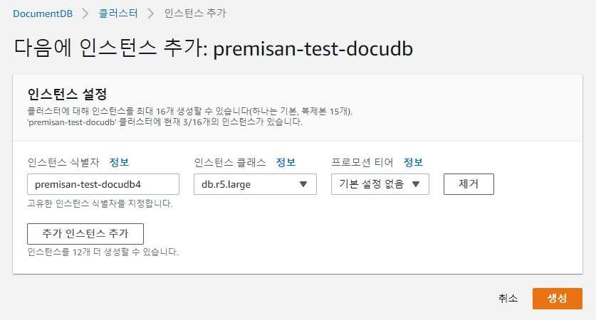 DocumentDB 클러스터 생성 시 인스턴스의 갯수는 최소 1개에서 최대 16개까지 생성할 수 있습니다. 인스턴스 개수가 2개 이상인 경우 1개의 쓰기 인스턴스를 가지며, 나머지 인스턴스는 읽기전용 복제본으로 생성됩니다. 인스턴스 개수의 경우 클러스터 생성 이후에 추가 인스턴스를 생성하거나, 기존 인스턴스를 삭제 가능합니다. 오로라 DB와 유사하게 디스크 사용량을 미리 지정하는 것이 아닌 사용함에 따라 자동으로 증가하기 때문에 디스크 사용량을 설정하는 옵션은 없습니다.