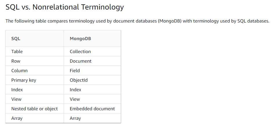 관계형 데이터베이스와 도큐먼트 데이터베이스에서 사용하는 용어의 차이는 아래와 같습니다.
