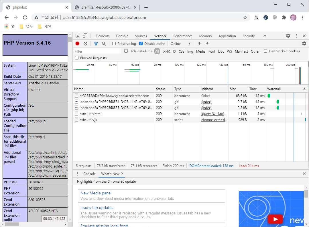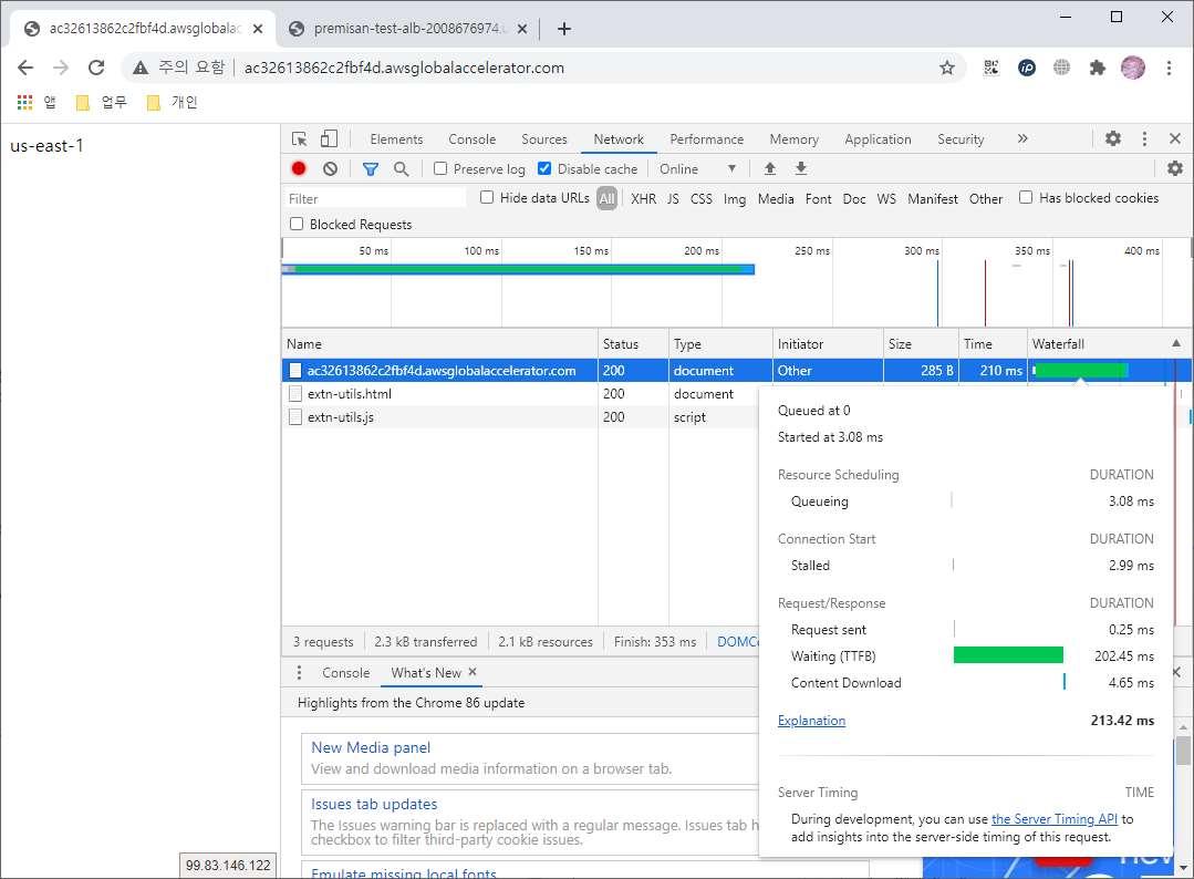 Accelerator의 도메인인 http://ac32613862c2fbf4d.awsglobalaccelerator.com 으로 접속했을 때, 버지니아 북부 리전의 로드밸런서로 연결되며,