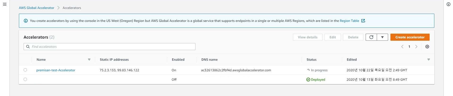 로드밸런서 생성 시 추가 서비스 부분에 AWS Global Accelerator에 대한 활성화 여부 옵션이 있기 때문에 로드밸런서 생성 시 Accelerator를 함께 생성 가능하며, AWS Global Accelerator 콘솔로 이동 시 로드밸런서와 함께 Accelerator가 생성된 것을 확인할 수 있습니다. (굳이 로드밸런서 생성 시 생성할 필요는 없으며, AWS Global Accelerator 콘솔에서 따로 Accelerator 생성해도 관계 없습니다.)