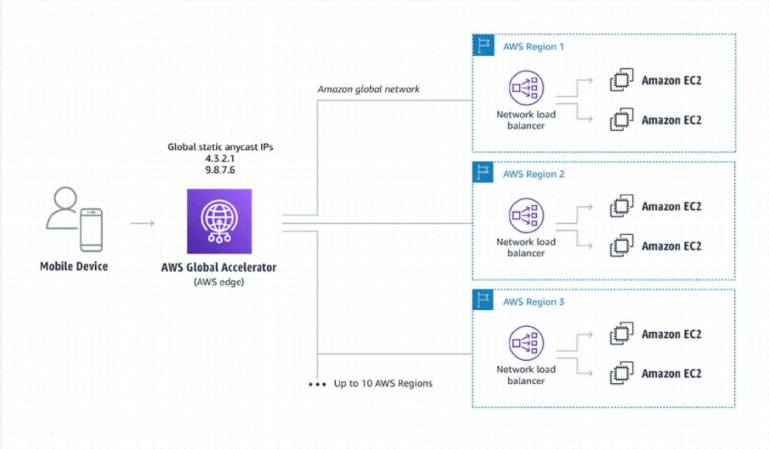 AWS Global Accelerator 서비스는 엣지 로케이션에 구성된, 2개의 고정 Anycast IP를 가진 Accelerator를 통해 사용자의 접속 위치가 가장 가까운 엔드포인트(ELB, EC2 등)로 트래픽을 라우팅합니다. 엣지 로케이션에서 엔드포인트까지의 트래픽은 AWS 글로벌 네트워크(AWS의 중첩된 100G 네트워크)를 이용하여 전송되기 때문에 Accelerator를 사용하지 않고 공공 인터넷망을 통해 엔드포인트에 접근하는 것에 비해 낮은 지연시간을 유지할 수 있습니다.