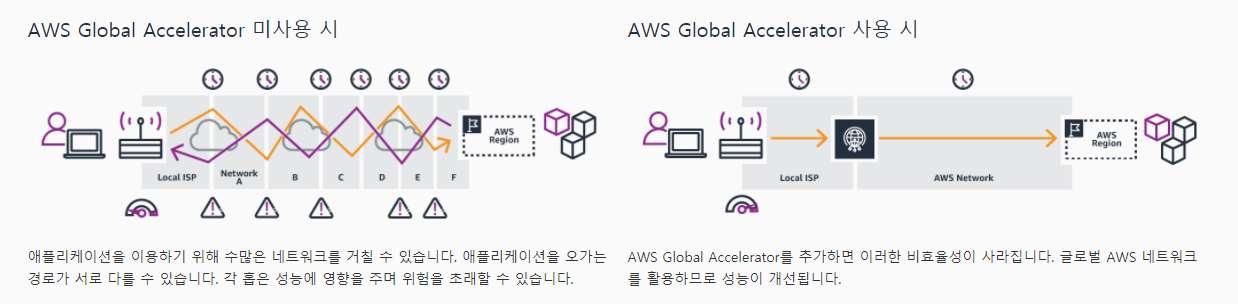 2. 클라우드프론트는 Web 기반이지만 AWS Global Accelerator는 TCP, UDP 기반이기 때문에 처리할 수 있는 프로토콜의 폭이 더 넓습니다. AWS Global Accelerator는 게임, VoIP(인터넷 전화) 등 클라우드프론트에서는 처리가 불가능한 프로토콜도 수용이 가능합니다.