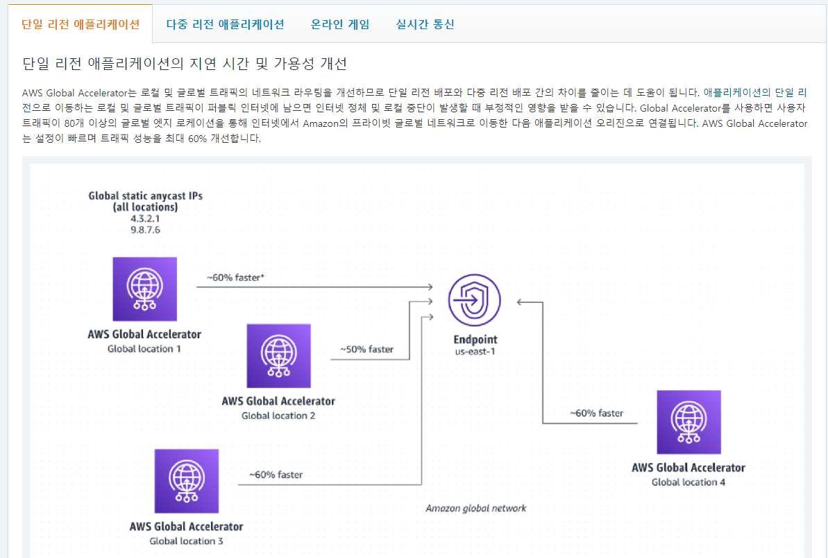 위의 테스트의 경우 2개 리전에 구성된 엔드포인트로 사용자의 접속 위치에 따라 다르게 연결되는 것을 보여줍니다. 하지만 다수 리전이 아닌 단일 리전으로 구성된 서비스의 경우에도, AWS 글로벌 네트워크를 통해 트래픽 가속(최대 60%까지)이 되는 것으로 내용을 파악하였으나,