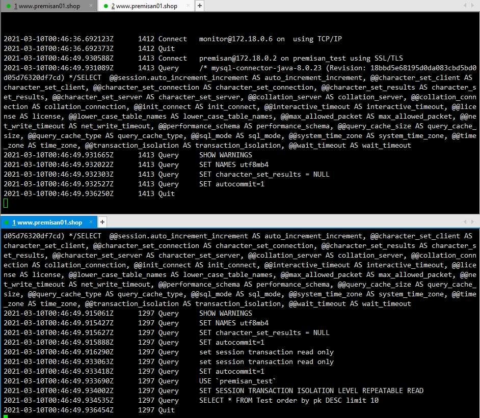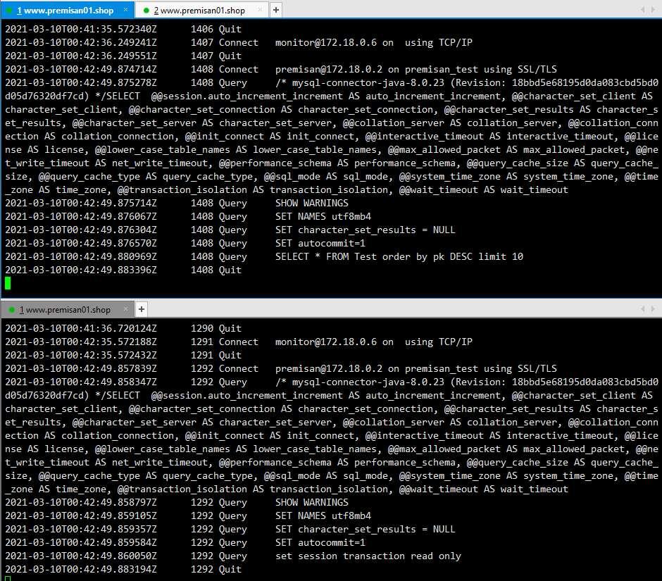 아래 이미지에서 위가 마스터 DB, 아래가 슬레이브 DB입니다. 마스터 DB로 SELECT 쿼리가 발생하는 것을 확인할 수 있습니다. MySQL Connector Replication 커넥션은 jdbc 구문에 입력한 모든 DB에 동시에 커넥션을 맺기 때문에 슬레이브 DB에는 쿼리가 실행되진 않았지만 커넥션은 발생한 것을 확인할 수 있습니다.