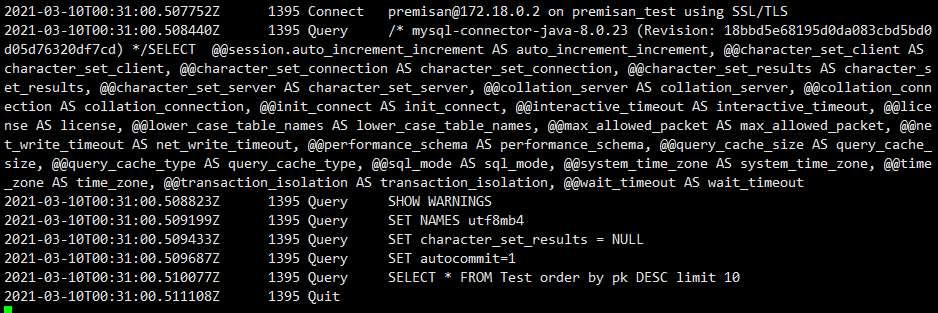DB 제너럴 로그 확인 시 아래와 같이 로그가 확인됩니다.