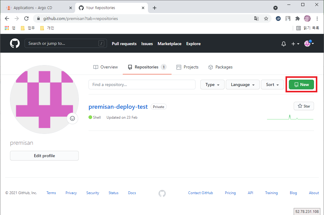 위에서 GitOps 방법론에 대해 소개하면서 배포와 관련된 모든 코드는 git을 통해 관리된다고 말씀드렸습니다. 때문에 테스트 앱에 사용할 쿠버네티스 yaml 파일을 업로드할 github 레포지토리를 생성하도록 하겠습니다. 자신의 레포지토리 목록으로 이동하여 New 버튼을 눌러 새 레포지토리를 생성합니다.