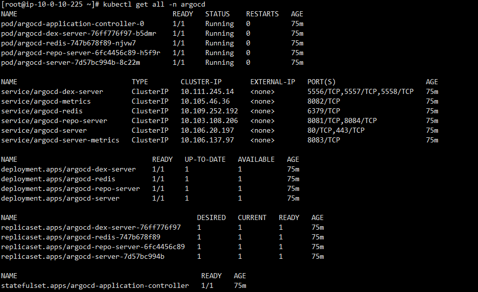 배포 방법은 굉장히 심플합니다. argocd 를 위한 네임스페이스를 별도로 생성하고 yaml 파일을 통해 배포합니다. 테스트 환경은 단일 EC2 인스턴스에 minikube로 구성된 쿠버네티스입니다.