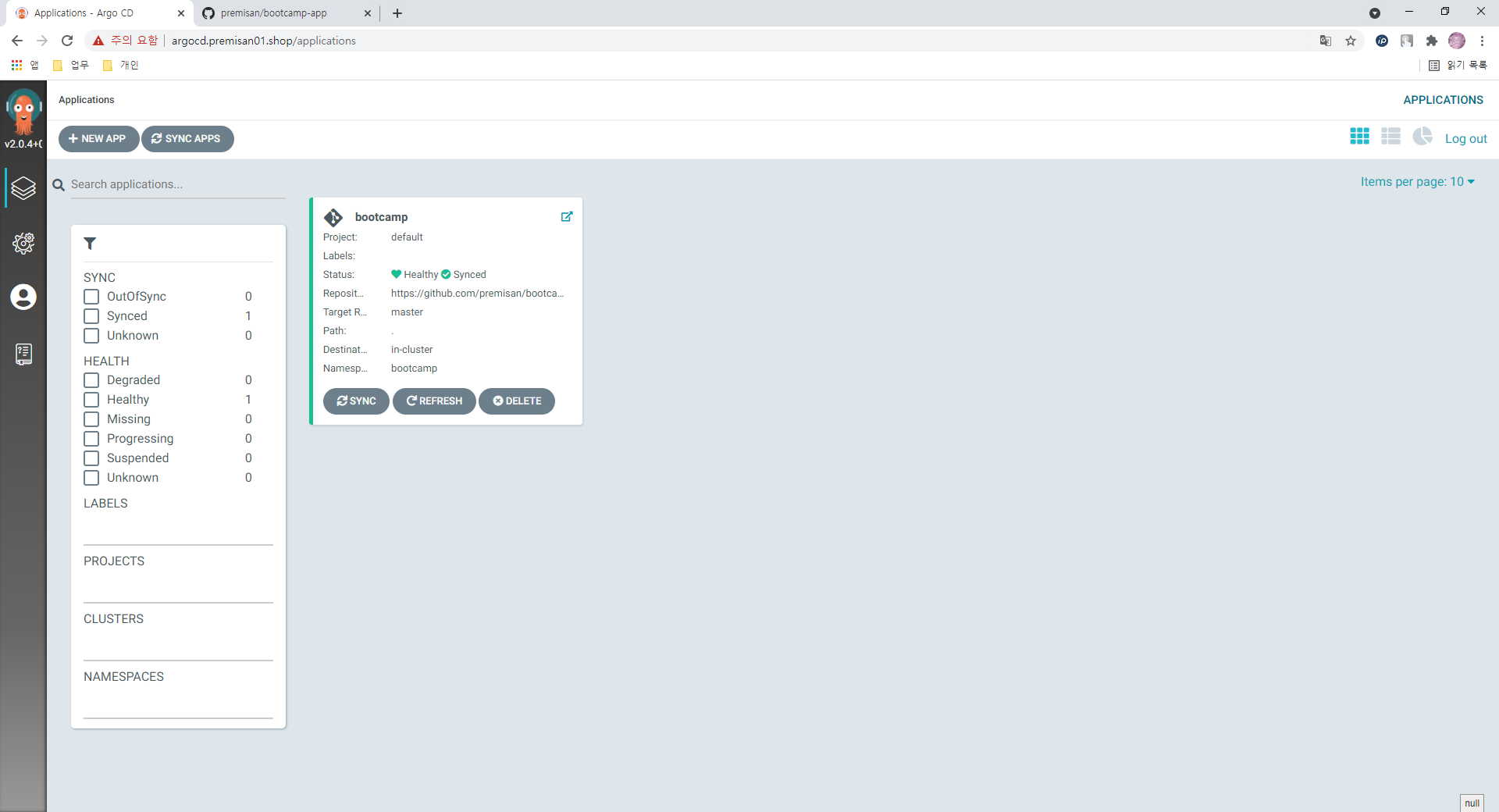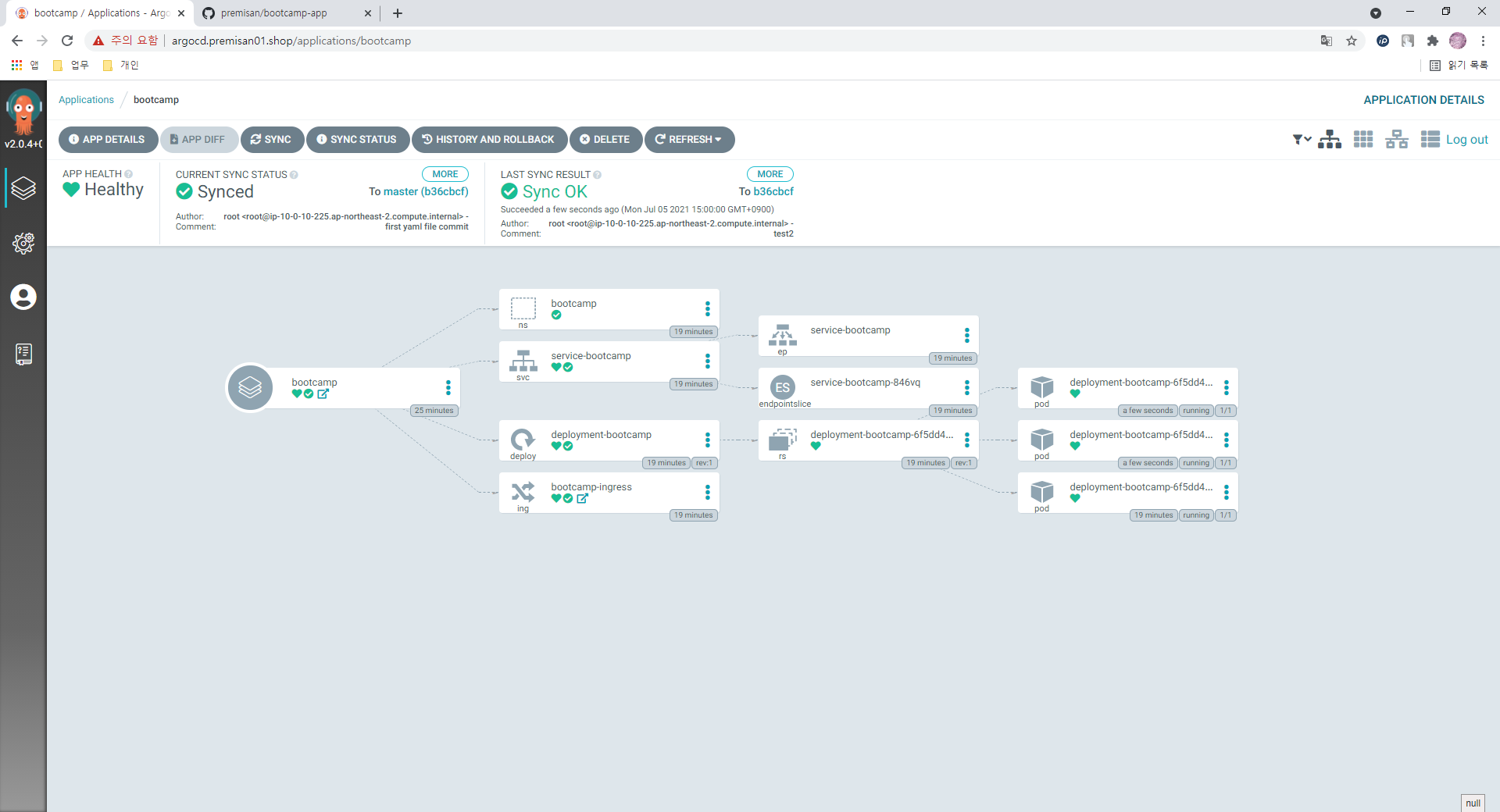 yaml 소스 코드가 수정된 뒤에 새 커밋으로 github에 푸쉬된 경우 다시 sync 버튼을 눌러 배포를 진행합니다.