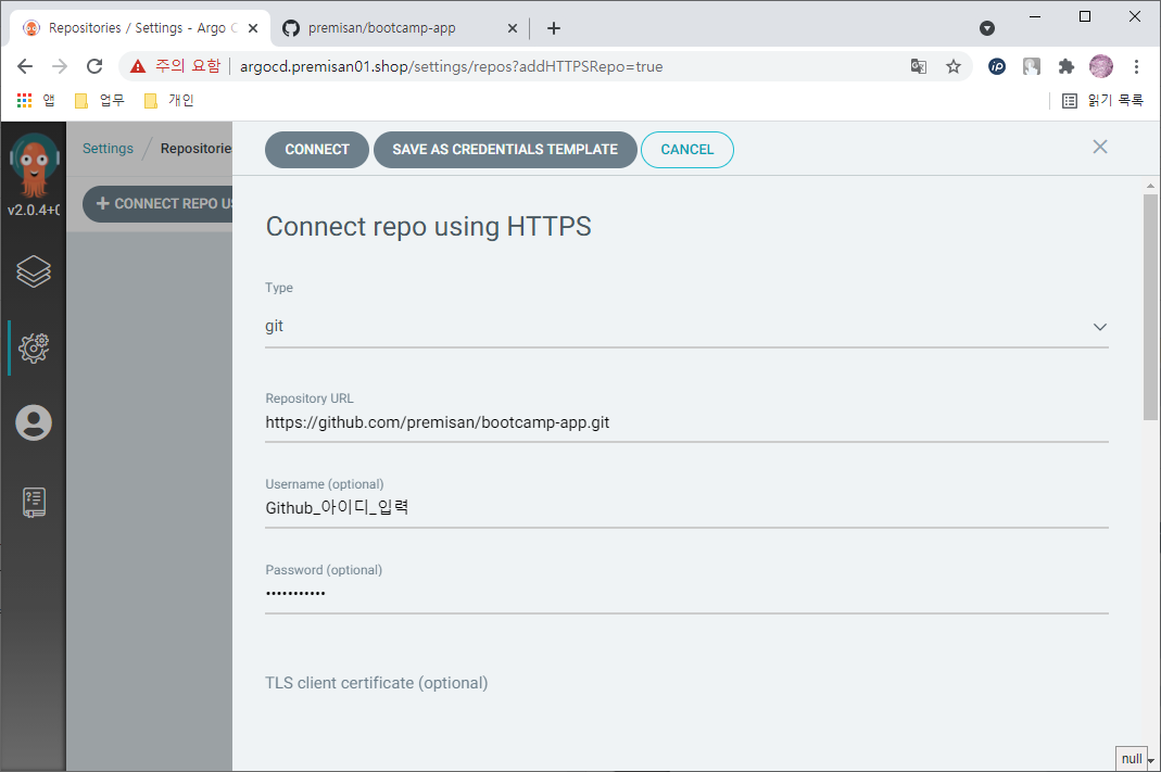 Connect Repo Using HTTPS 버튼을 클릭합니다.