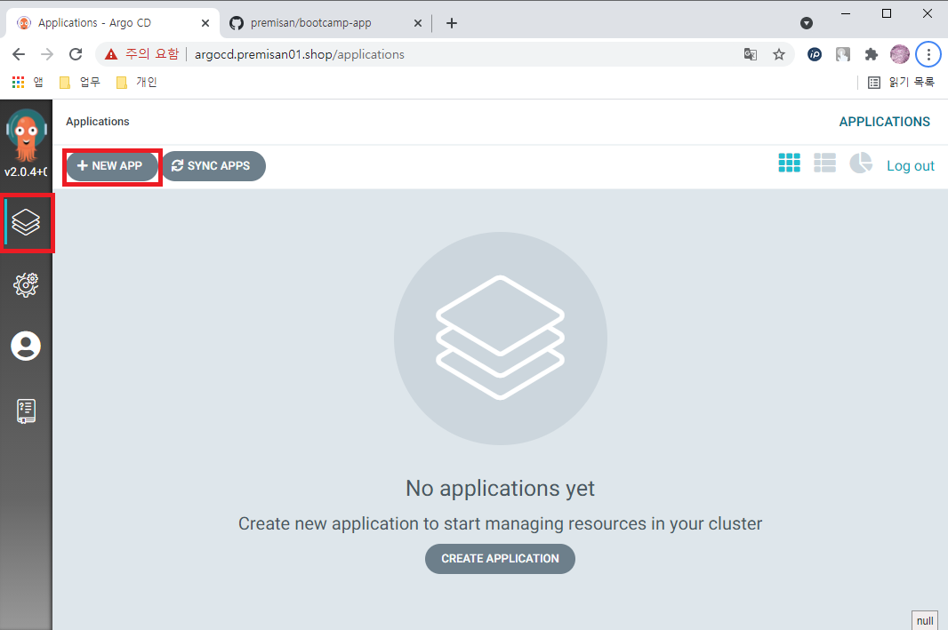이제 소스 코드와 github 레포 구성까지 완료되었으니 앱을 생성해봅니다. 먼저 좌측 메뉴 최상단의 Appications 메뉴로 이동하여 New App 버튼을 눌러 새 앱을 생성합니다.