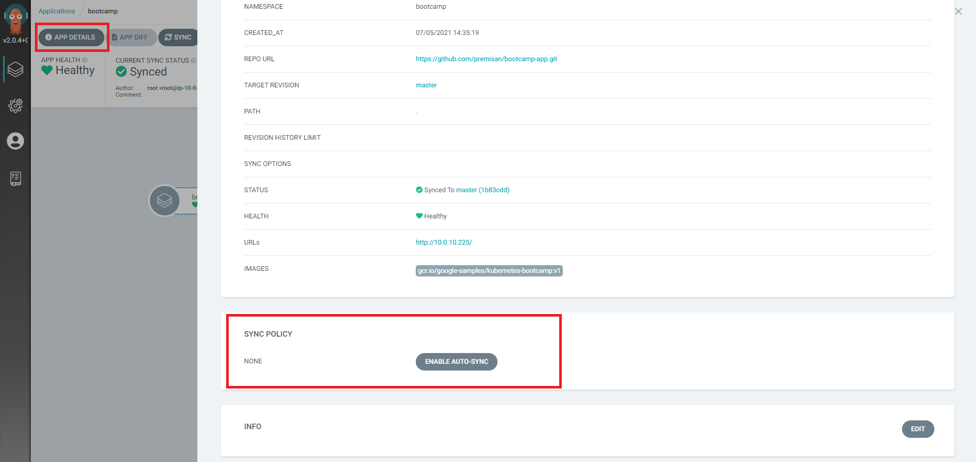 이전 앱 생성 단계에서 자동 싱크를 설정해도 되지만 위에서는 수동으로 배포하는 방법을 보여드리기 위해 수동 sync로 생성해봤습니다. 이제 앱의 자동 sync 관련 설정을 활성화해주도록 하겠습니다. 자동 sync를 활성화하는 경우 3분마다 github 소스 코드를 풀링하여 변경사항이 있는 경우 자동으로 배포합니다.