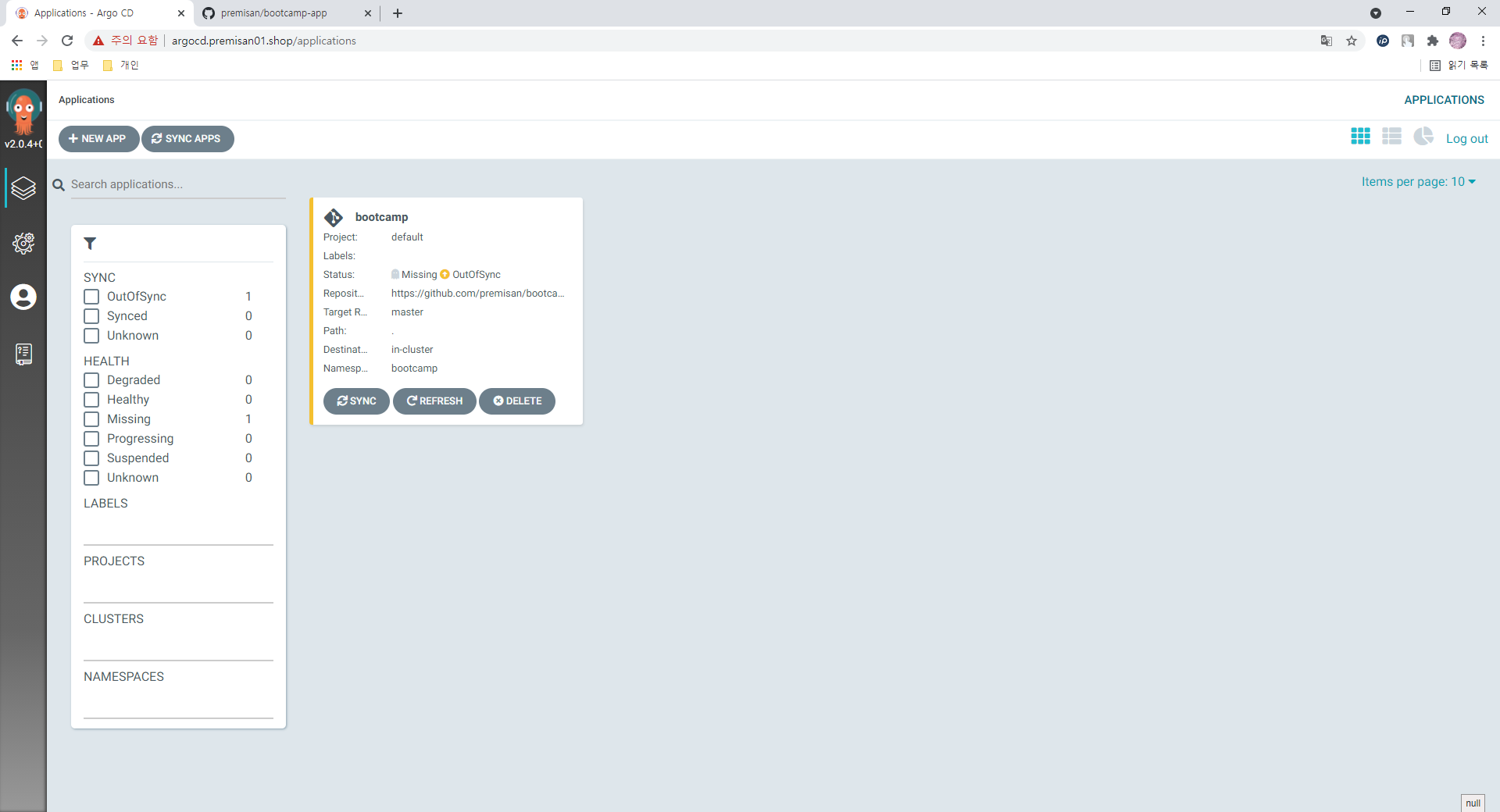 현재는 앱은 생성했지만 실제로 배포가 되지는 않은 상태입니다. 배포를 수행하기 위해서는 앱의 sync 버튼 -> synchronize 버튼을 눌러 배포를 수행합니다.