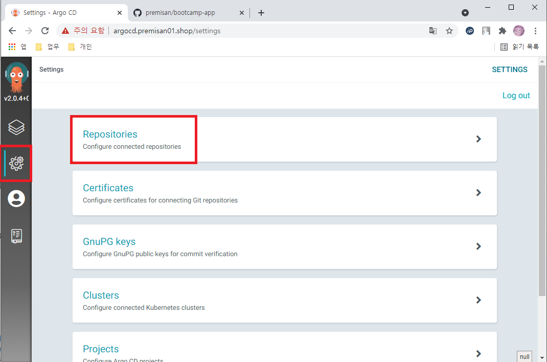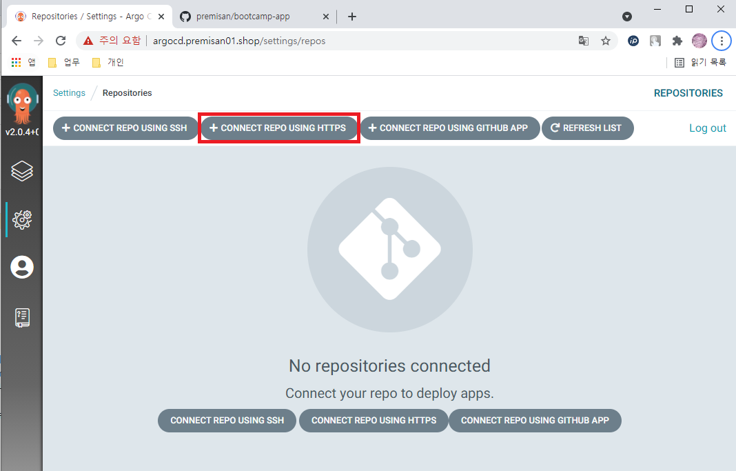 공개 레포지토리라면 argocd 에서 별도로 레포지토리를 등록해주지 않더라도 바로 앱 생성이 가능하지만, 비공개 레포지토리의 경우 github 계정으로 로그인이 필요하기 때문에 argocd 에서 해당 레포지토리를 풀링하기 위해서는 먼저 argocd 에 인증 정보와 함께 레포지토리를 등록하는 작업을 선행합니다. 좌측 메뉴 바에서 톱늬바퀴 모양 설정 메뉴를 클릭하여 Repositories 메뉴를 선택합니다.