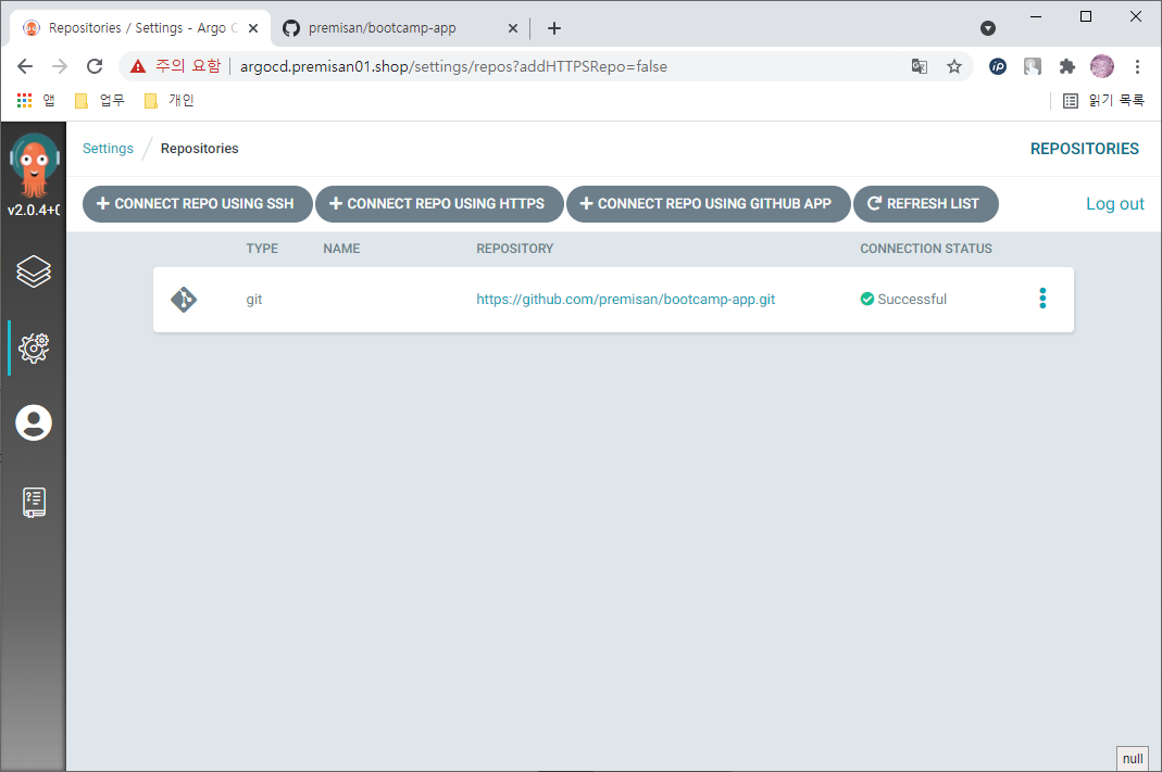 Connect 버튼을 눌러 마무리하면 아래와 같이 github 레포가 추가됩니다.
